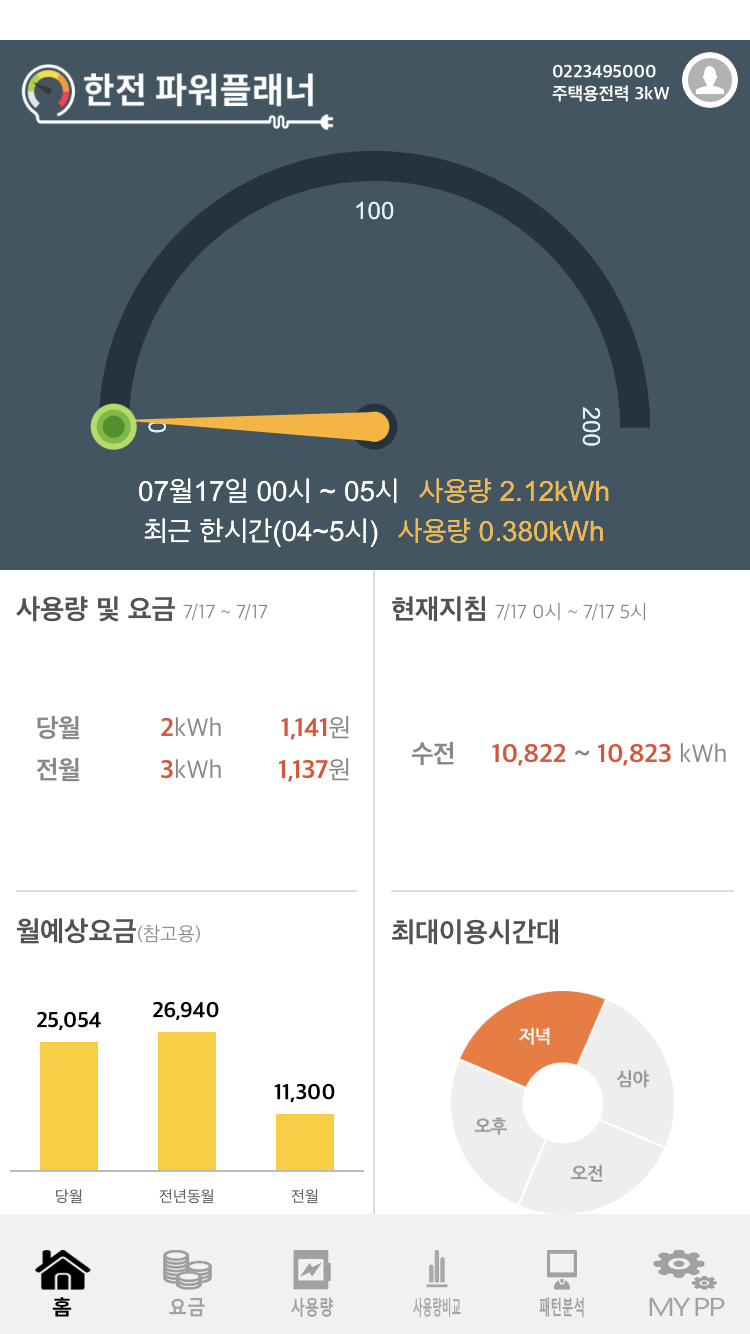 1) 메인 홈 화면에서는 전기세 사용량, 월 사용요금, 사용 시간대를 한눈에 파악할 수 있습니다.