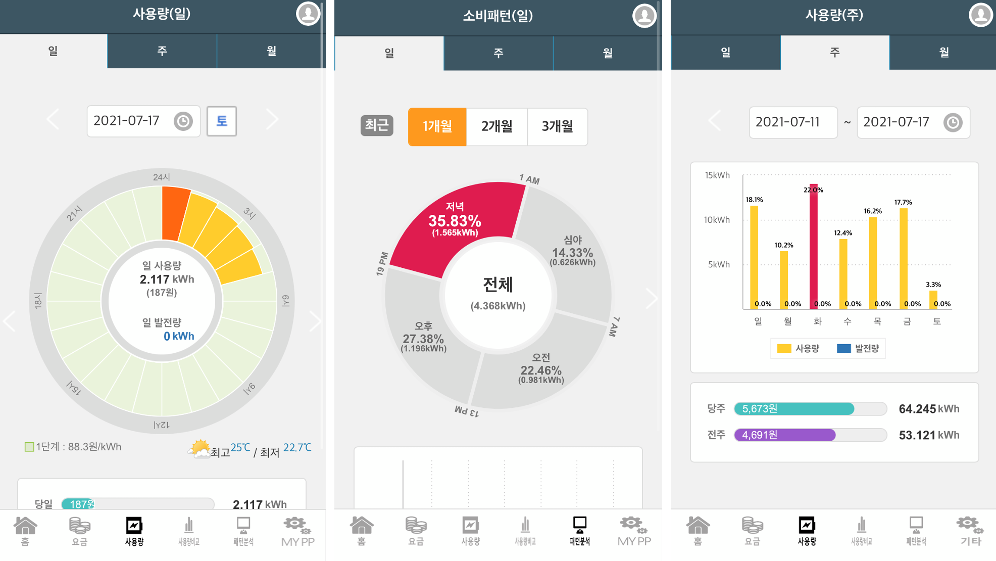 3) 마지막으로 사용량 화면에서는 일별/주별/월별 사용 시간과 소비 패턴을 확인할 수 있습니다.