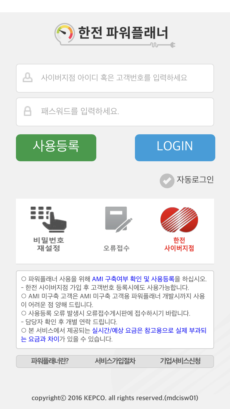1) 회원가입 시 고객번호 혹은 전력량계 번호 입력이 필요합니다.