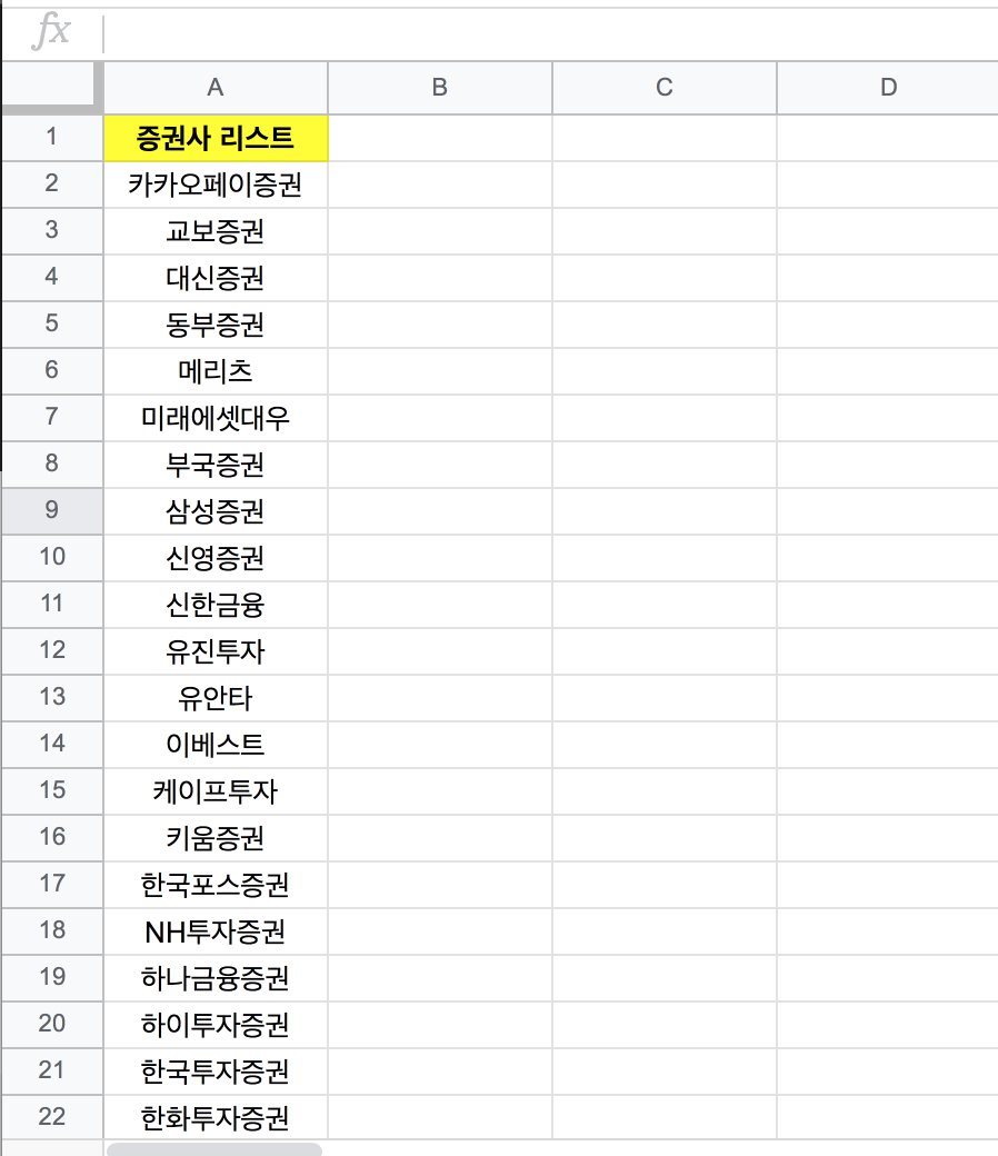 Step 1. 증권사 명을 빈 시트에 1열로 작성합니다.