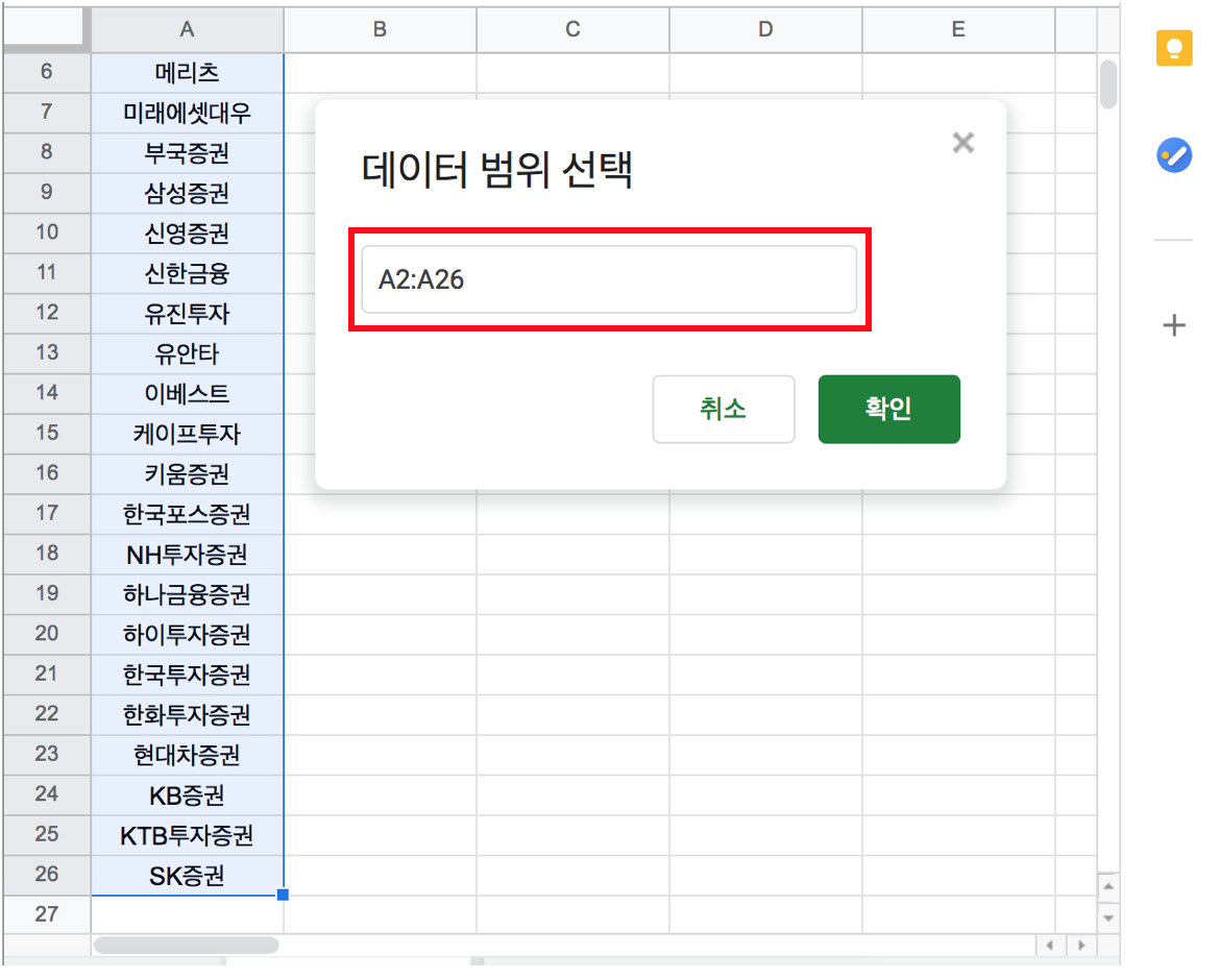 Step 4. 증권사 명이 적힌 셀을 범위로 지정 후, 저장 버튼을 클릭합니다.